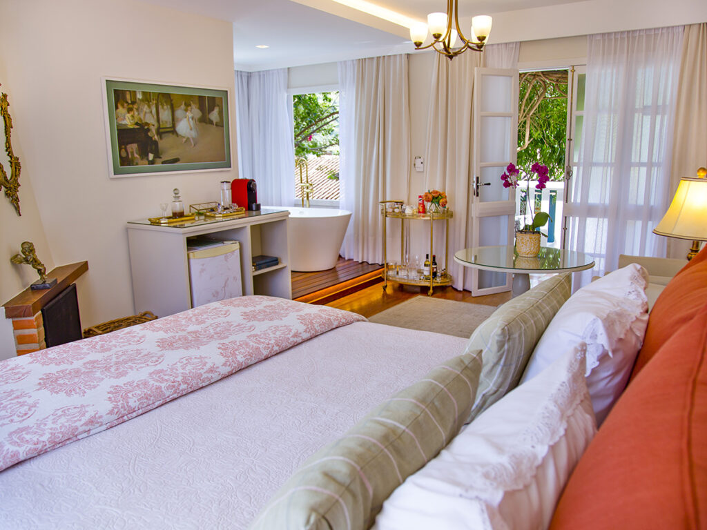 Descritivo: Suíte térrea, varanda de entrada com vista para rua central da pousada e para a Pedra Azul, janela com vista para a mata, banheira de imersão, lareira a lenha e banheiro privativo. Equipada com cama Queen size com pillow top, travesseiros e edredom de plumas, lençóis e toalhas em algodão egípcio, frigobar equipado, Smart TV, ar condicionado, poltronas, mesa de jantar, roupões de seda da Índia e roupões atoalhados da Trousseau, sandálias, secador de cabelo e secador de toalha. Licor de cortesia.