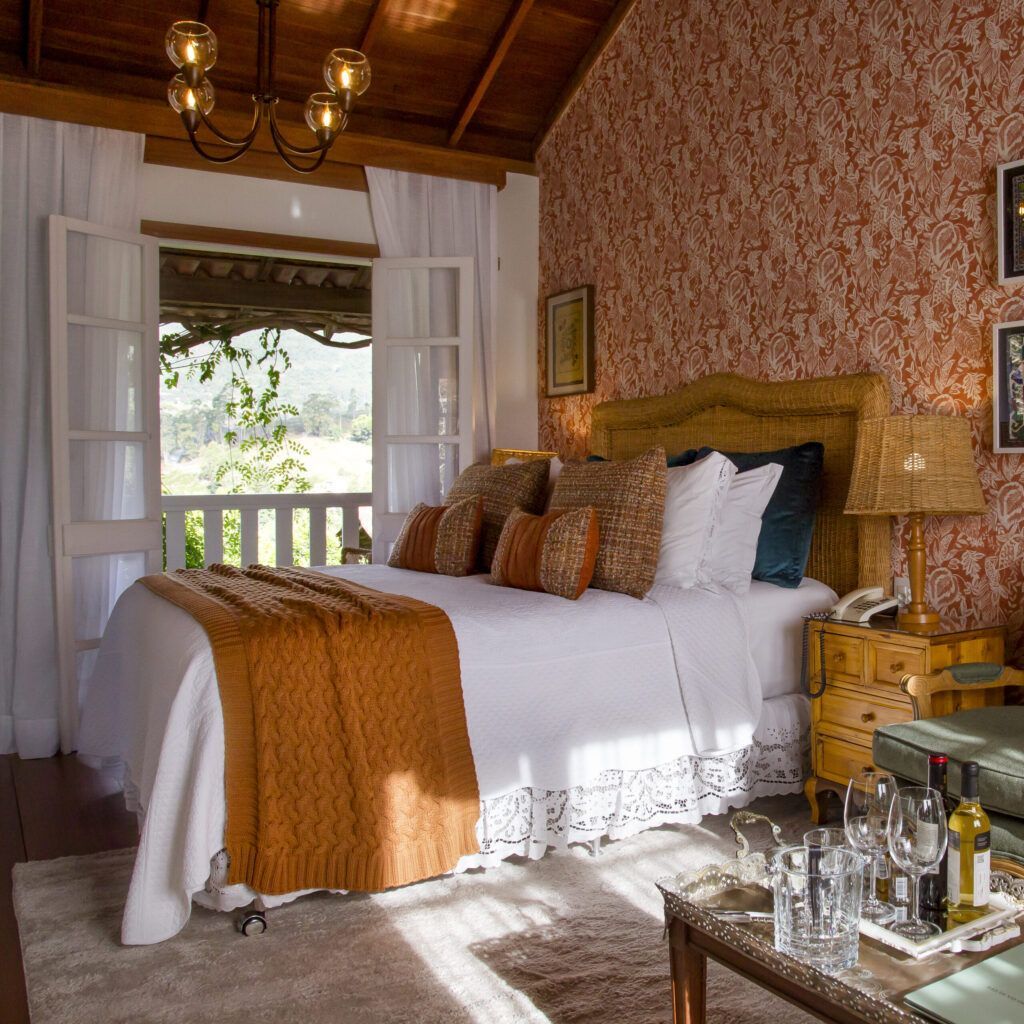 Descritivo: Suíte em andar superior com banheira de hidromassagem, quarto amplo e integrado com sala, ambiente da lareira a lenha e varanda. Equipada com poltronas, mesa de jantar, Smart TV, frigobar, secador de cabelo, secador de toalhas, máquina de café Nespresso, ar condicionado, edredom de plumas, lençóis e toalhas de algodão egípcio,  roupões de seda da Índia e roupões atoalhados da Trousseau e sandálias. Vista frontal para a Pedra Azul a partir da cama, varanda, banheira e do chuveiro. Licor de cortesia.