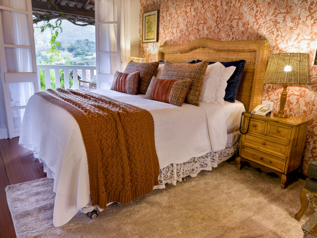 Descritivo: Suíte em andar superior com ofurô, quarto amplo e integrado com sala, ambiente da lareira a lenha e varanda. Equipada com Smart TV, frigobar, secador de cabelo, máquina de café Nespresso, ar condicionado, edredom de plumas, lençóis e toalhas de algodão egípcio, roupões de seda da Índia e roupões atoalhados da Trousseau, sandálias e secador de toalhas. Vista frontal para a Pedra Azul a partir da cama, varanda ofurô e do chuveiro e janela com vista para a mata. Licor de cortesia.
